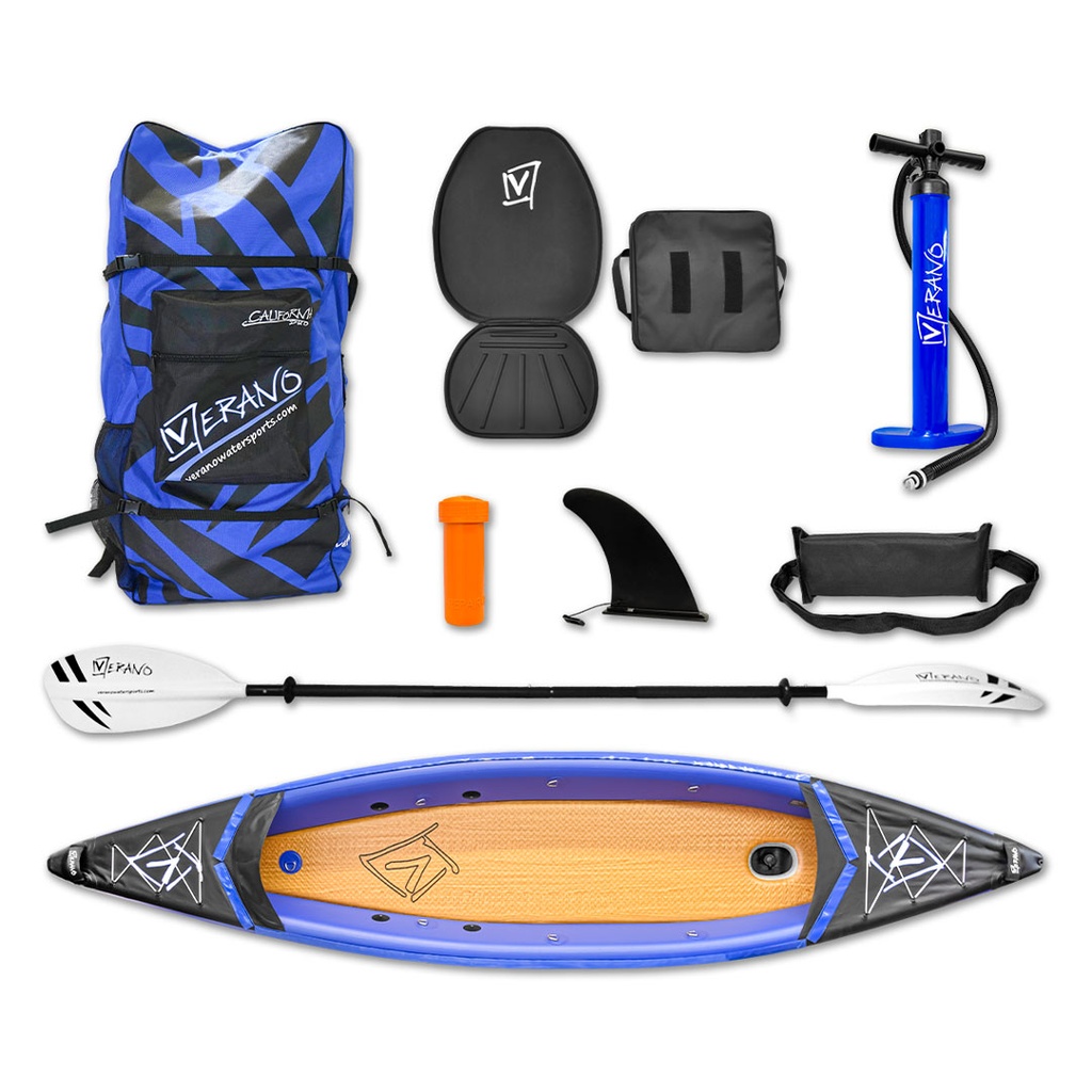 In addition to the boat, extensive accessories are also included as standard: The Verano backpack/trolley with zipper and wheels ensure easy transport. The kayak double-bladed paddle with fibreglass shaft and a length of 240 cm can be dismantled into four parts. With the double-stroke high-pressure pump supplied, the desired operating pressure is reached within a few minutes. The package also includes a repair kit.